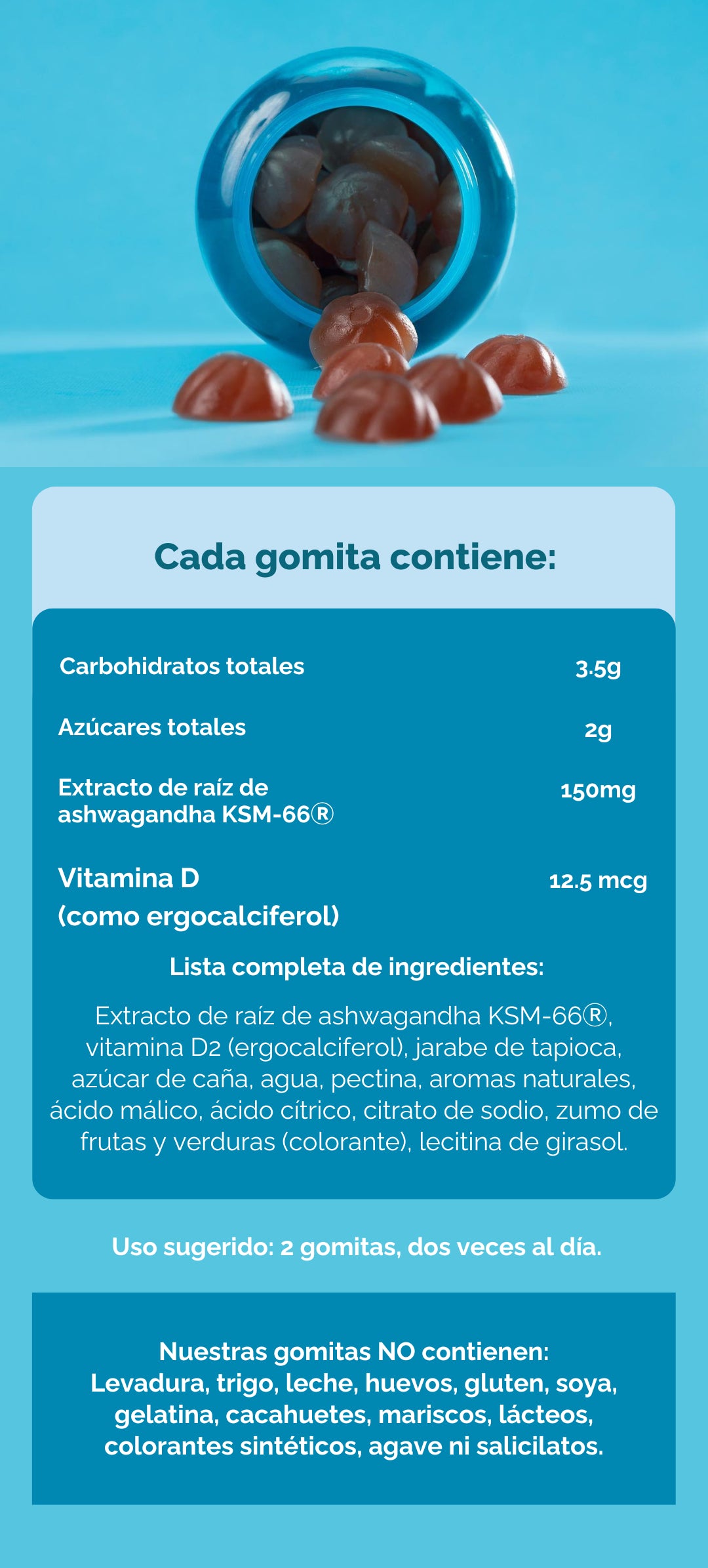 La dosis recomendada es de2 gomitas al día. Puedes tomarlas juntas o dividirlas (una en la mañana y otra en la noche), con o sin alimentos.